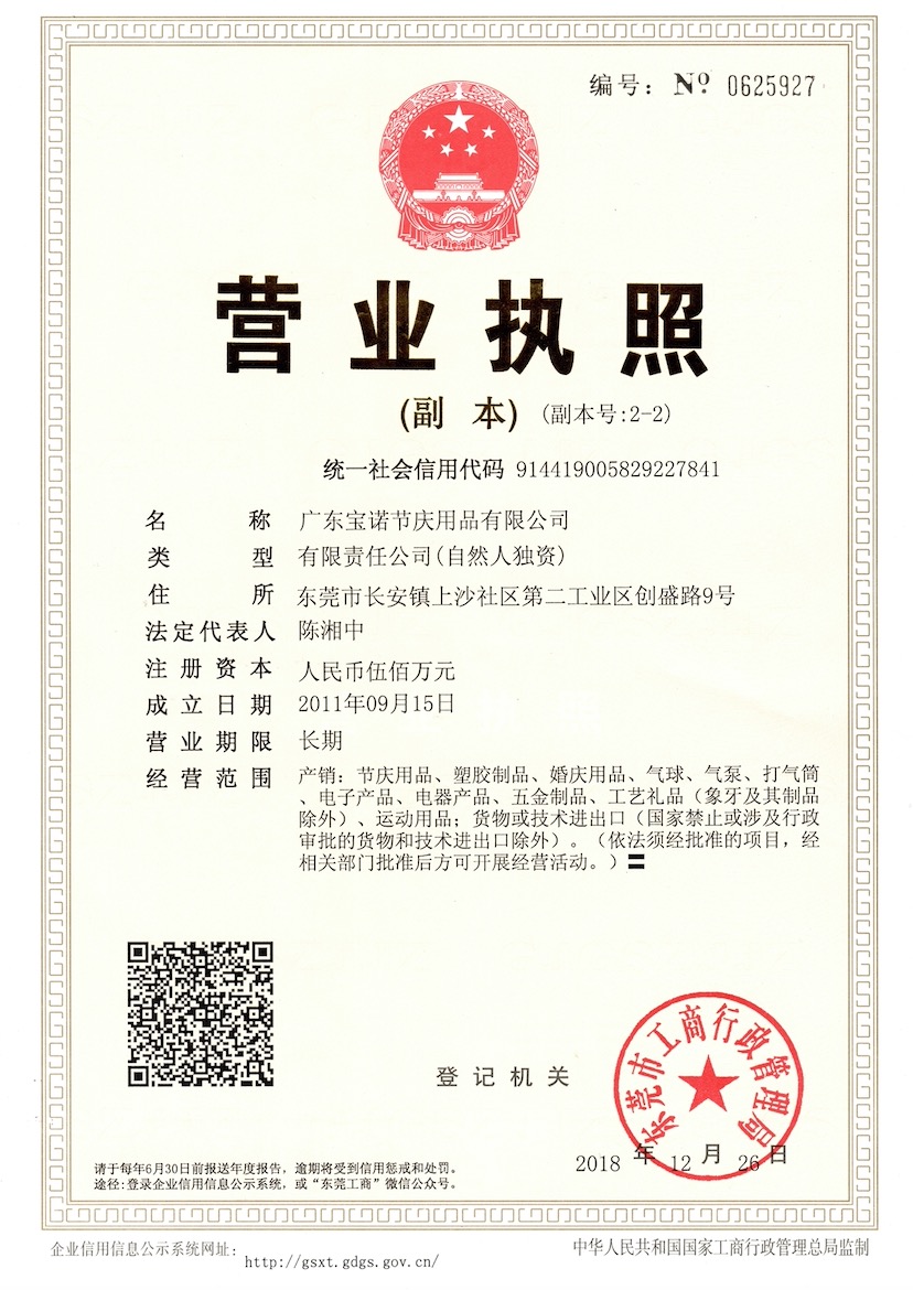 为了更好的为宝诺客户提供更多元的产品和服务,东莞市宝诺塑胶制品有限公司于2018年12月26日正式更名为广东宝诺节庆用品有限公司。